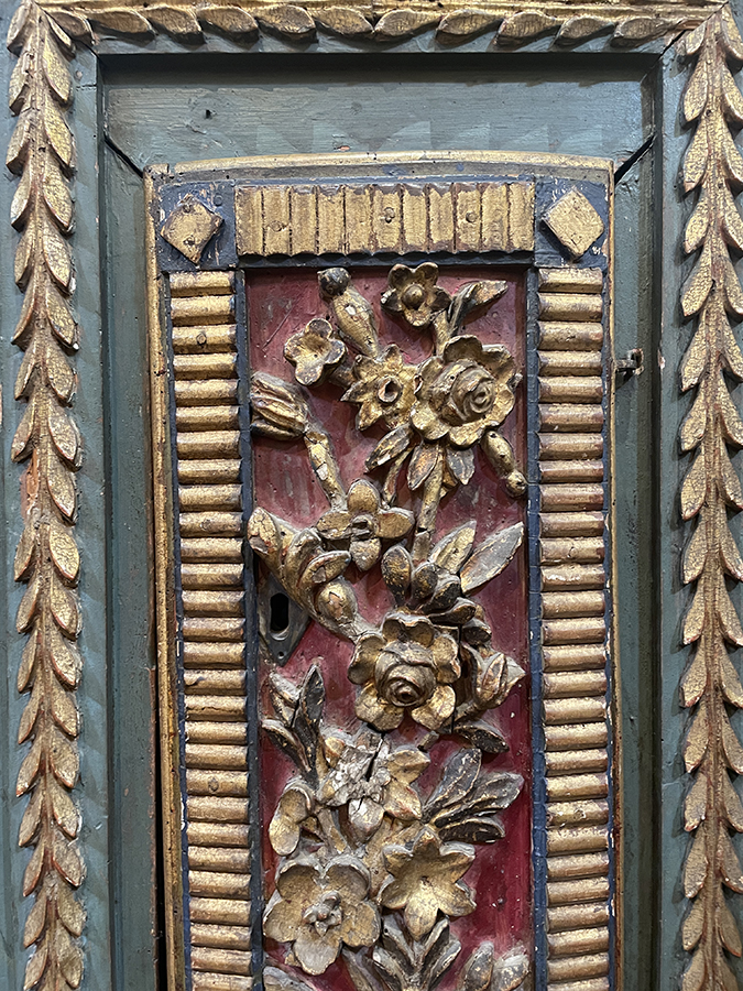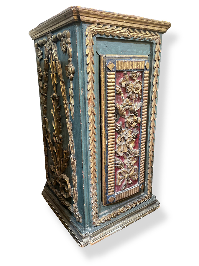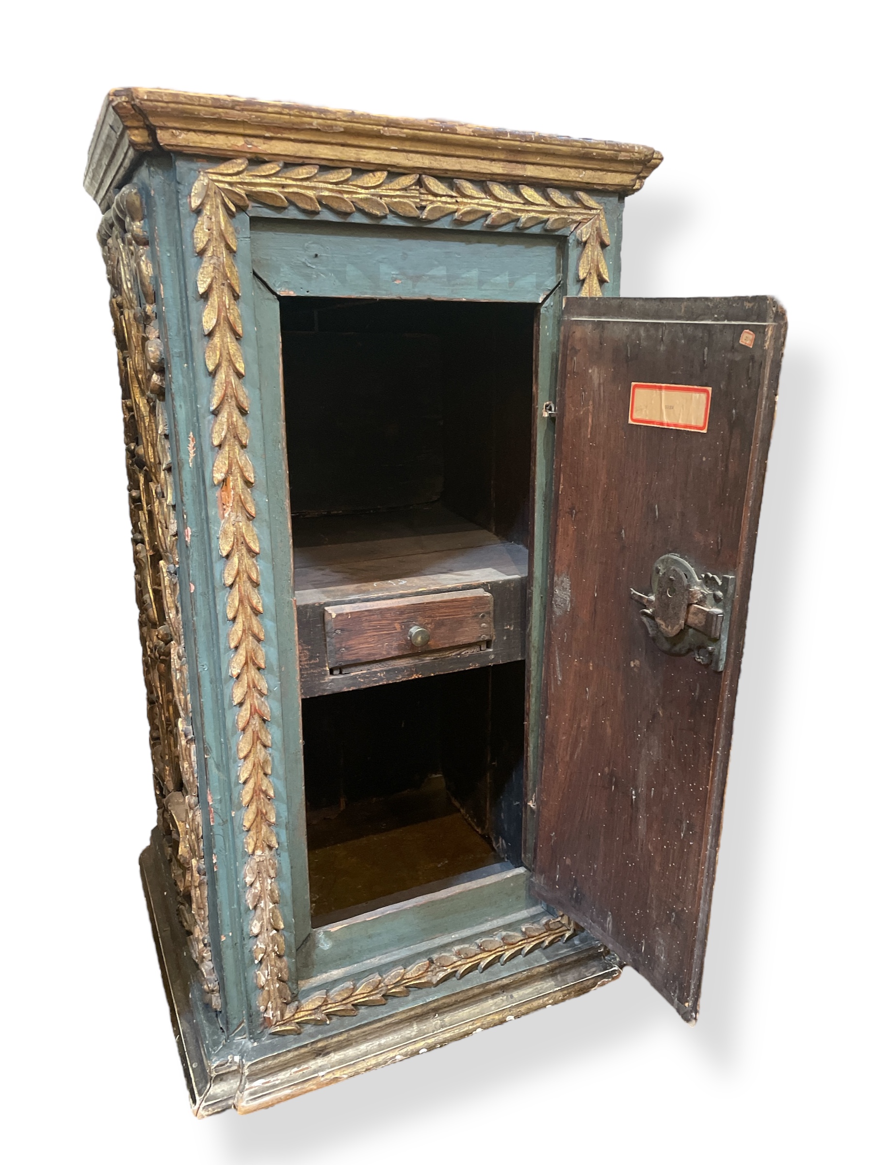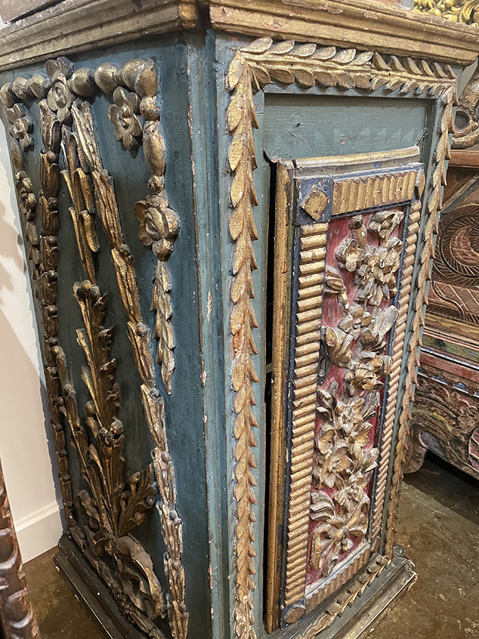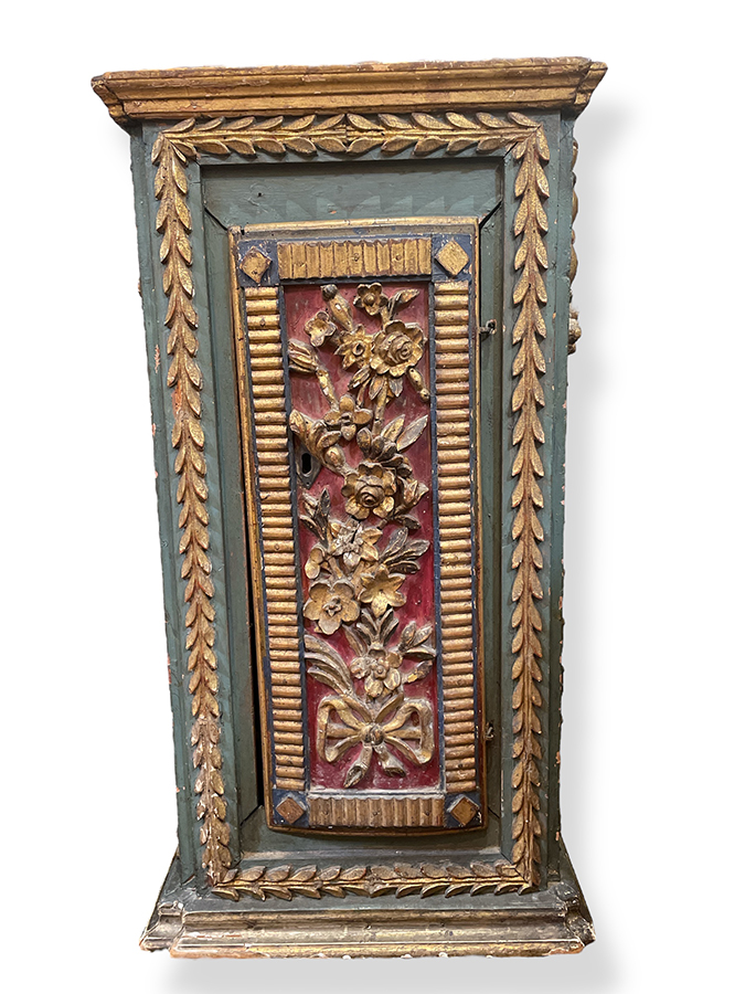 17th C Italian polychrome Baroque cabinet with interior shelf (Please note: door closes but has warped with time.)
