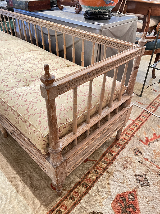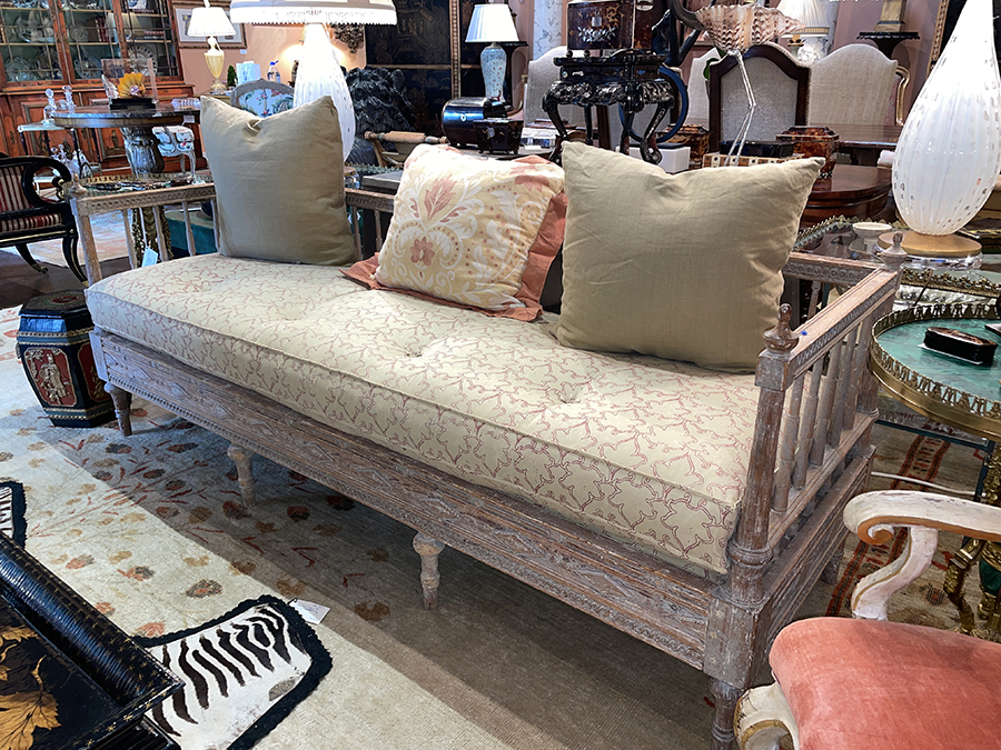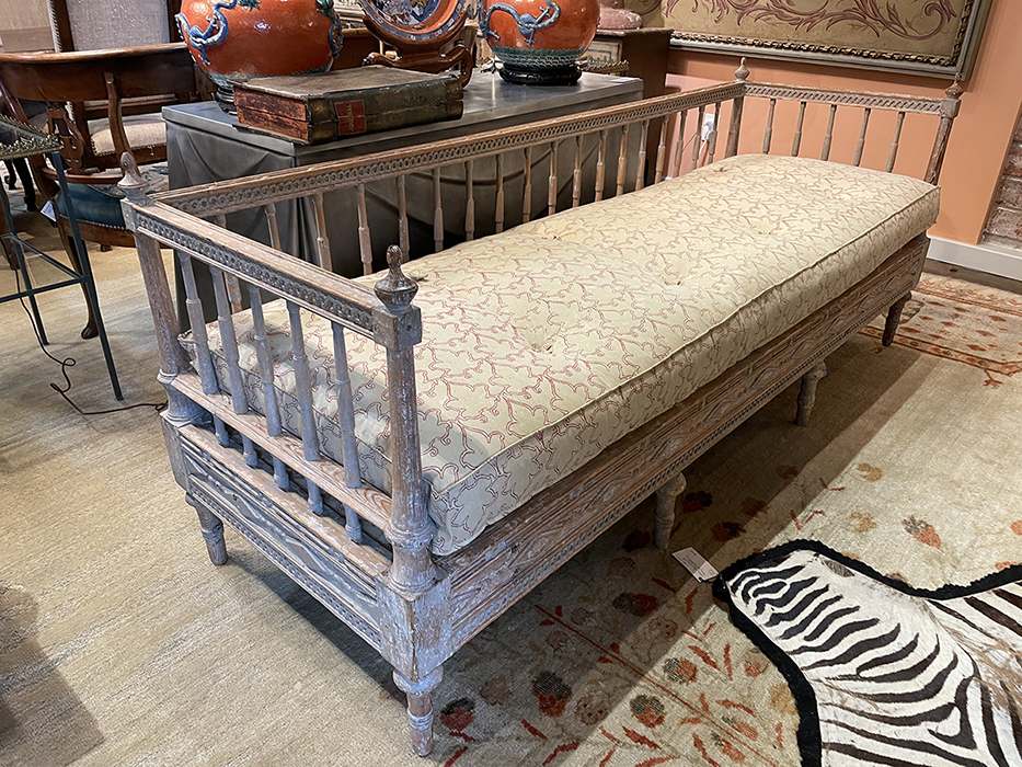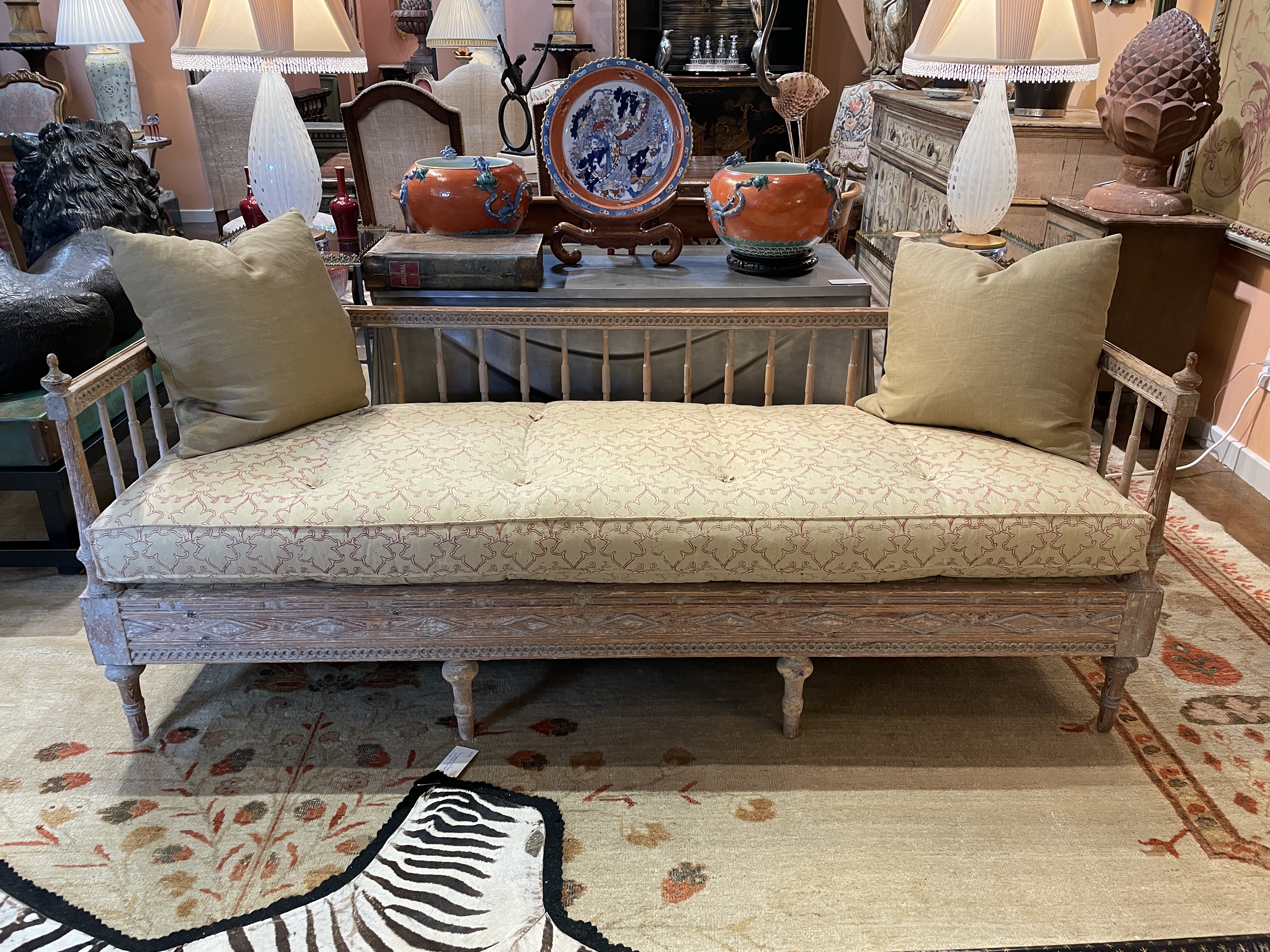 Circa 1800, Swedish Gustavian settee. (One front leg has surface damage. The cushion and pillows have significant wear.)