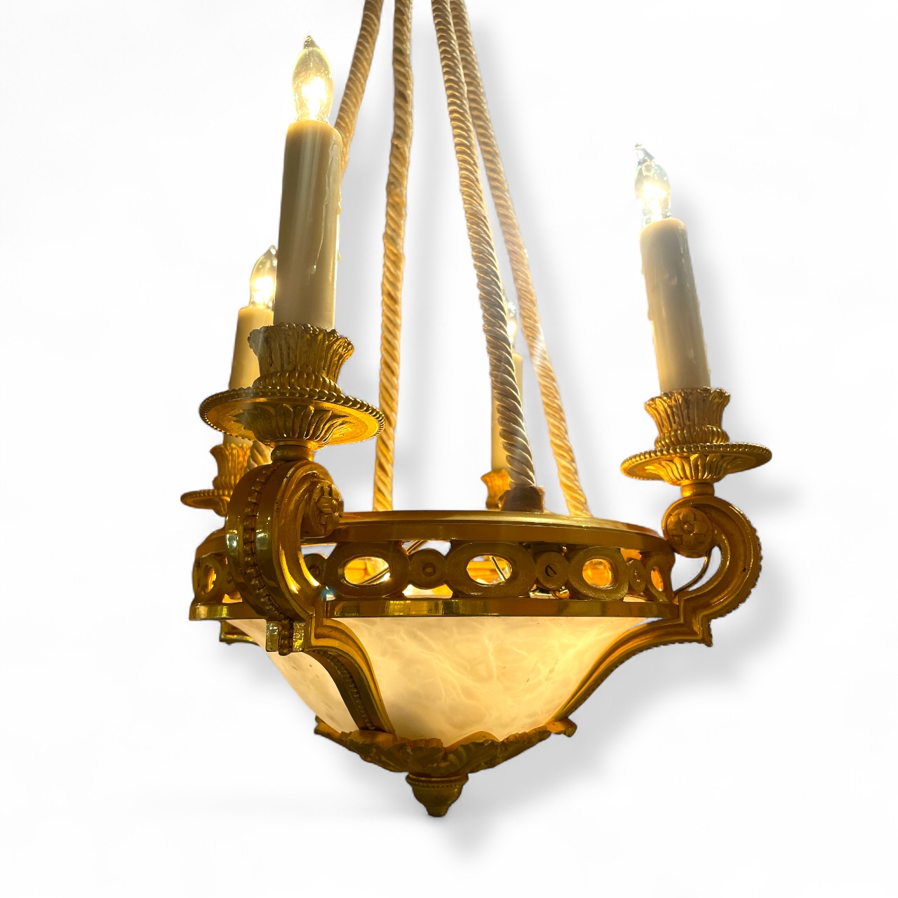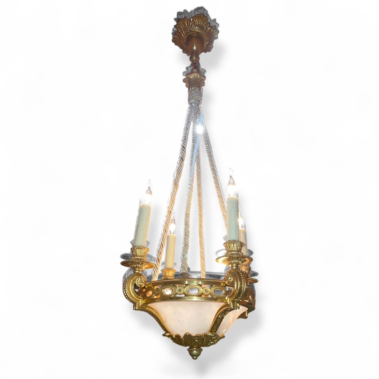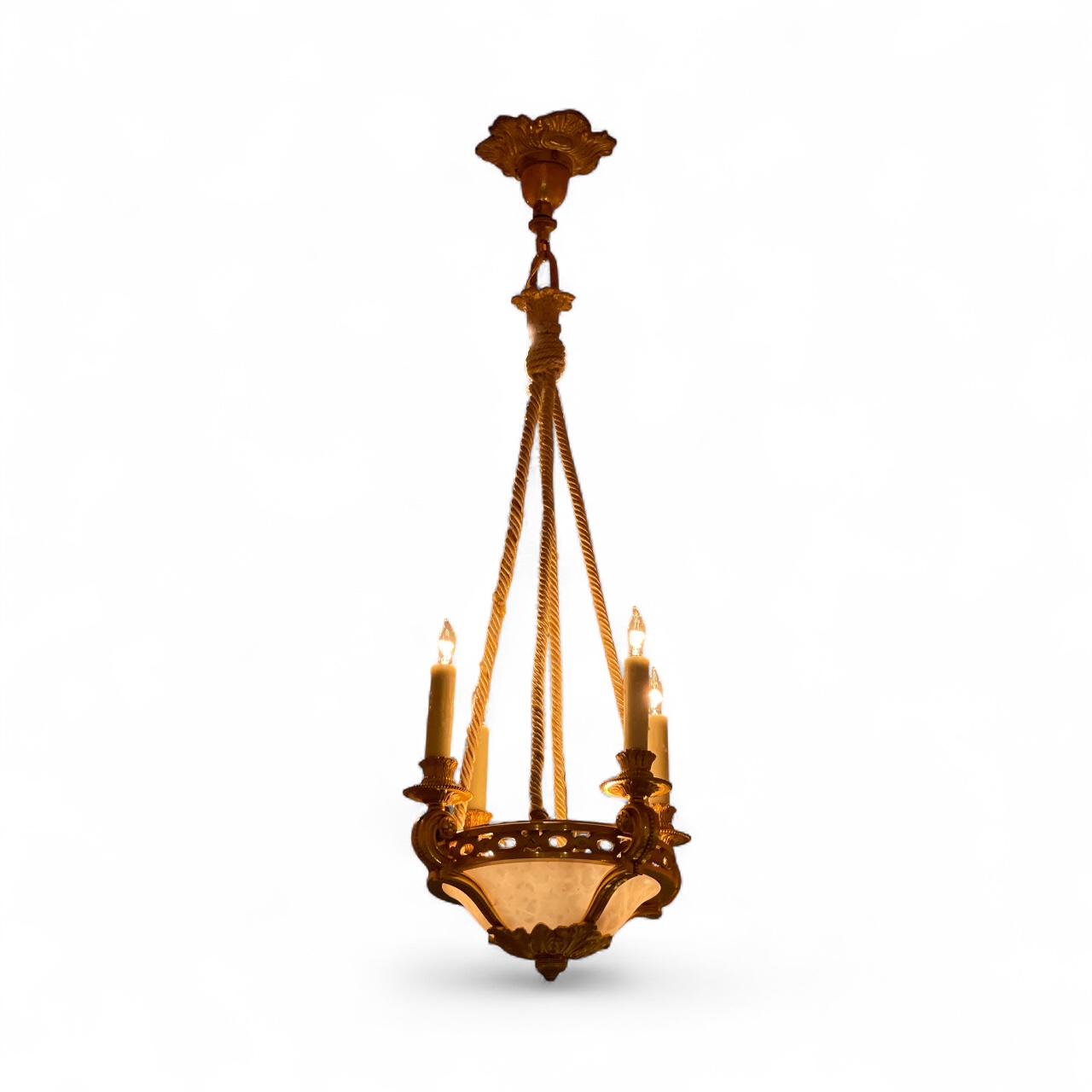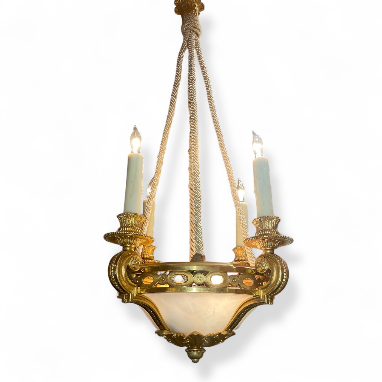 Circa 1920 French gilt bronze and alabaster four light pendant chandelier.