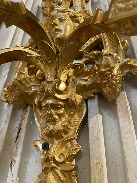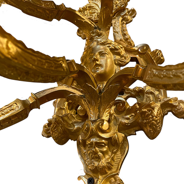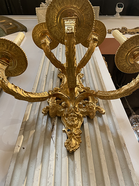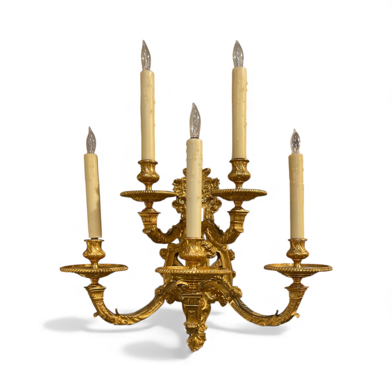 Pair of French gilt bronze 5-light sconces with center mask.