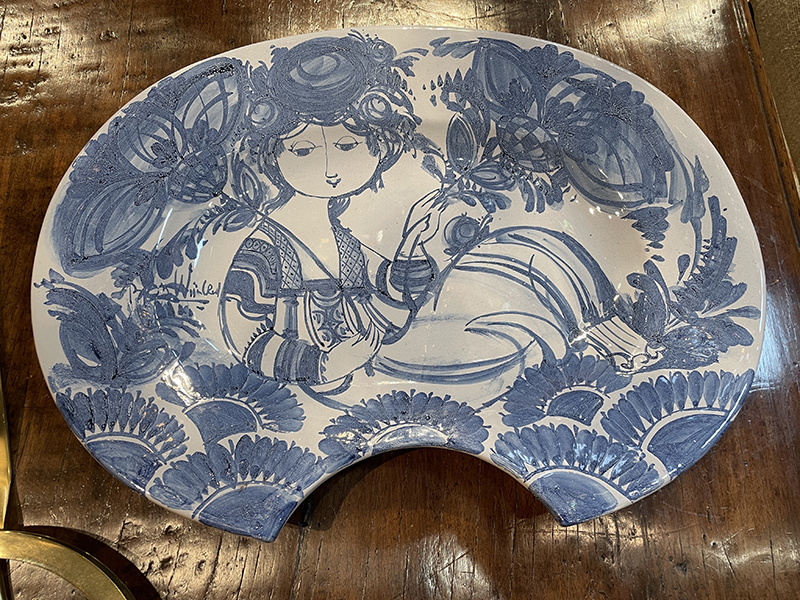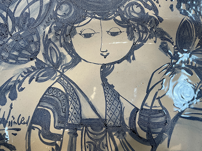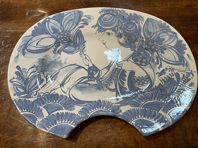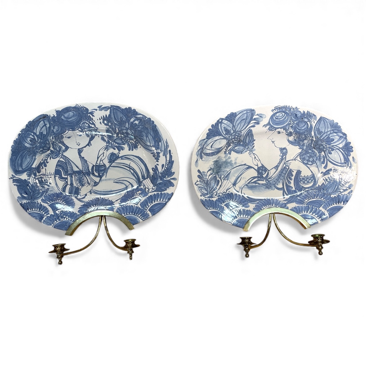 Pair of Bjorn Wiinblad (Danish 1919-2006) blue and white gazed pottery in brass candle wall sconces with an underglazed design. (Each are signed.)