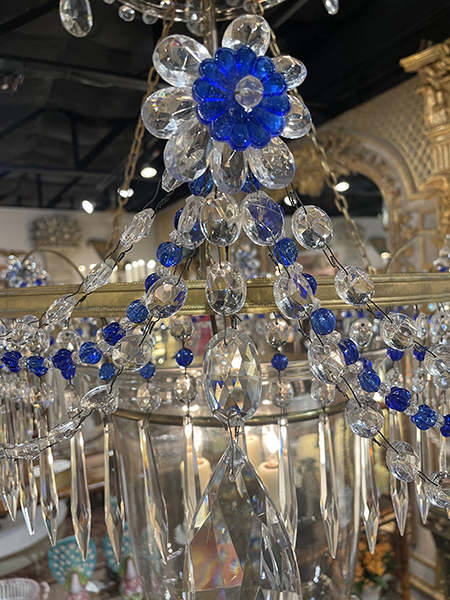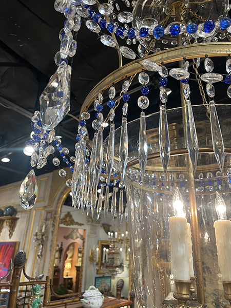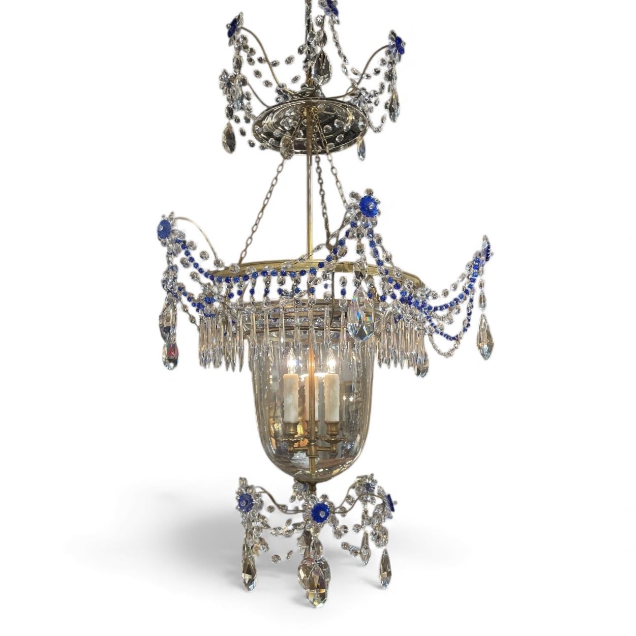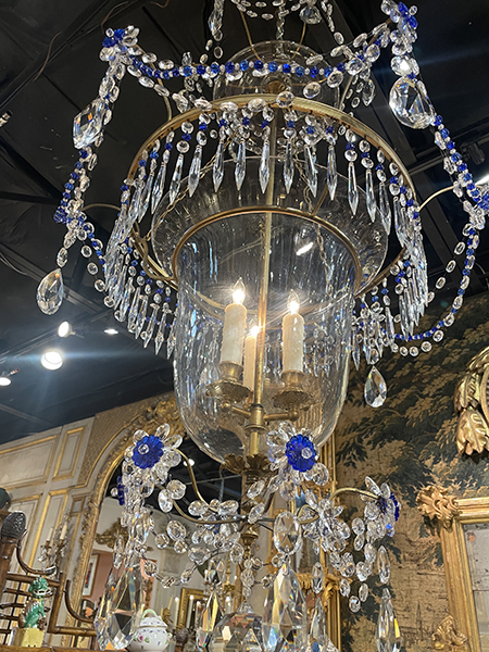 19th C Baltic three light crystal, glass and incised brass chandelier in clear and blue. Constructed with a center lidded glass bell jar, prisms and beading detail. Rewired and cleaned. The large glass bell is a replacement.