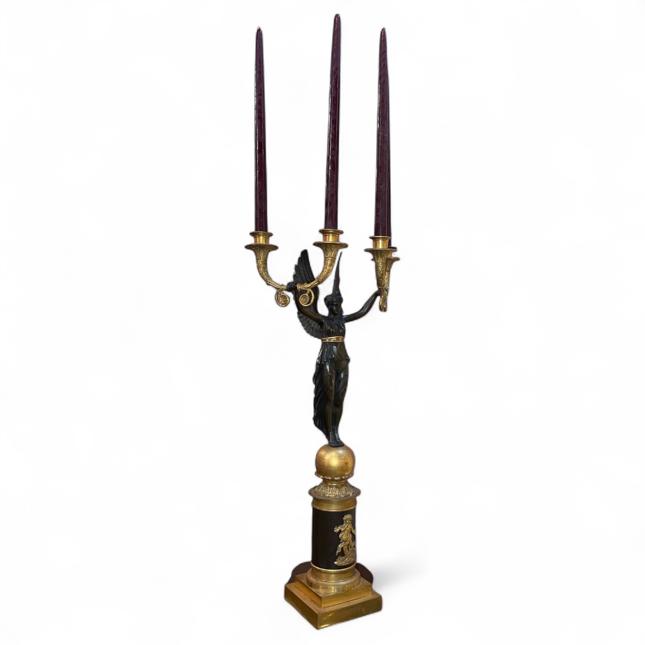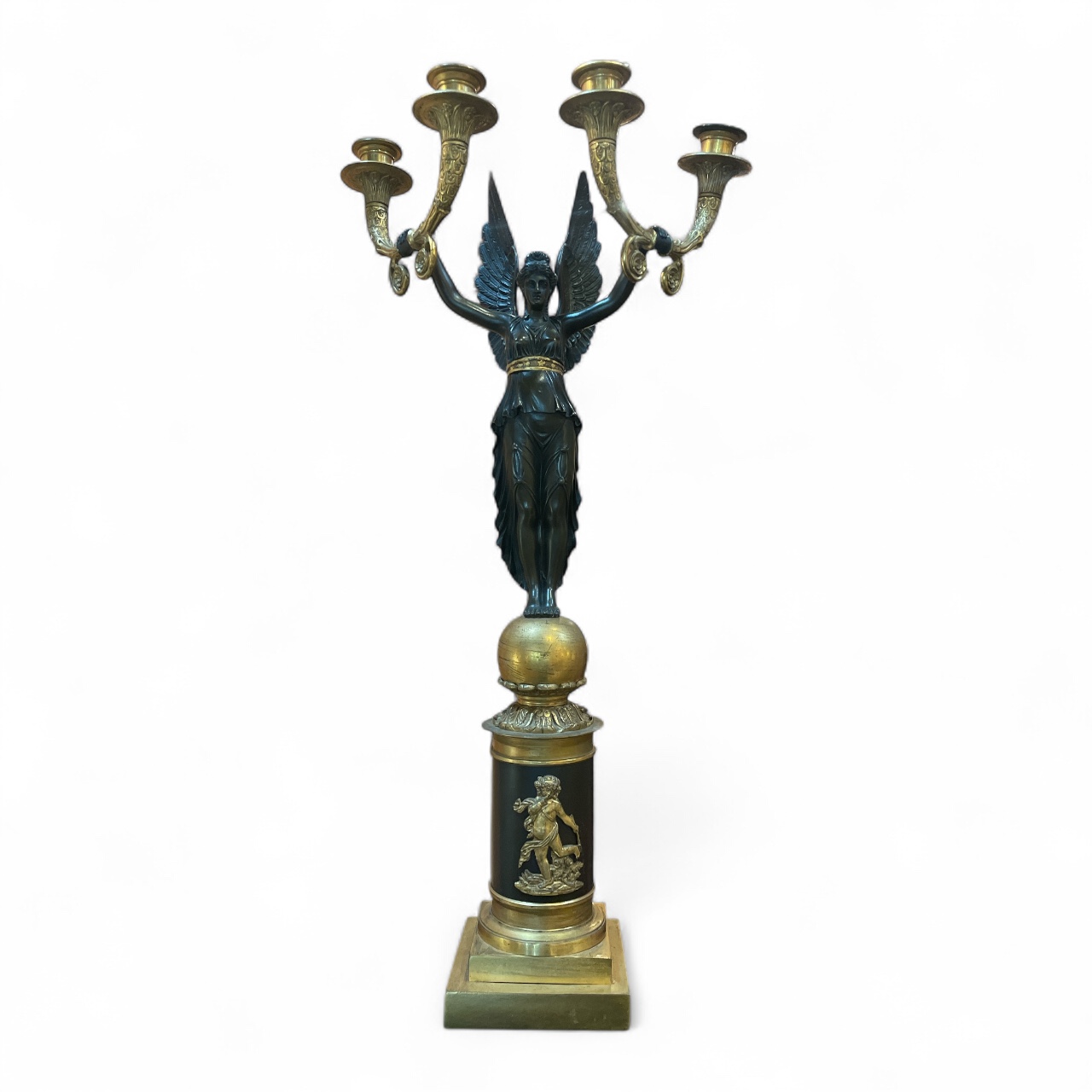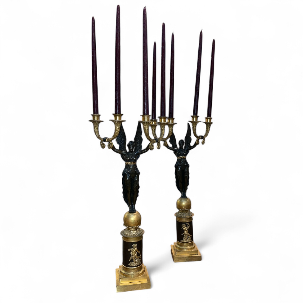 Circa 1815 pair of French Empire gilt and patinated bronze winged victory four-light candelabra. These were previously wired to be lamps.